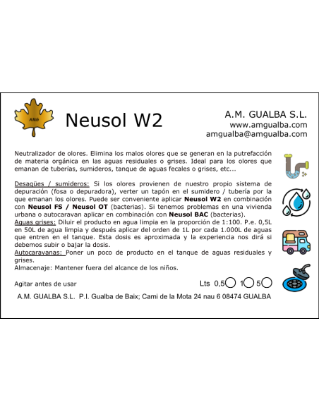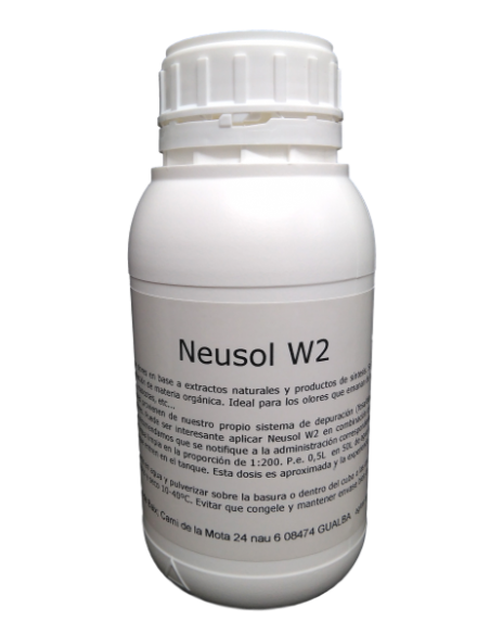 Neusol W2 0,5L es un producto en base a extractos naturales y de síntesis para eliminar el olor de origen orgánico: aguas residuales y grises, bajantes, tuberías,...